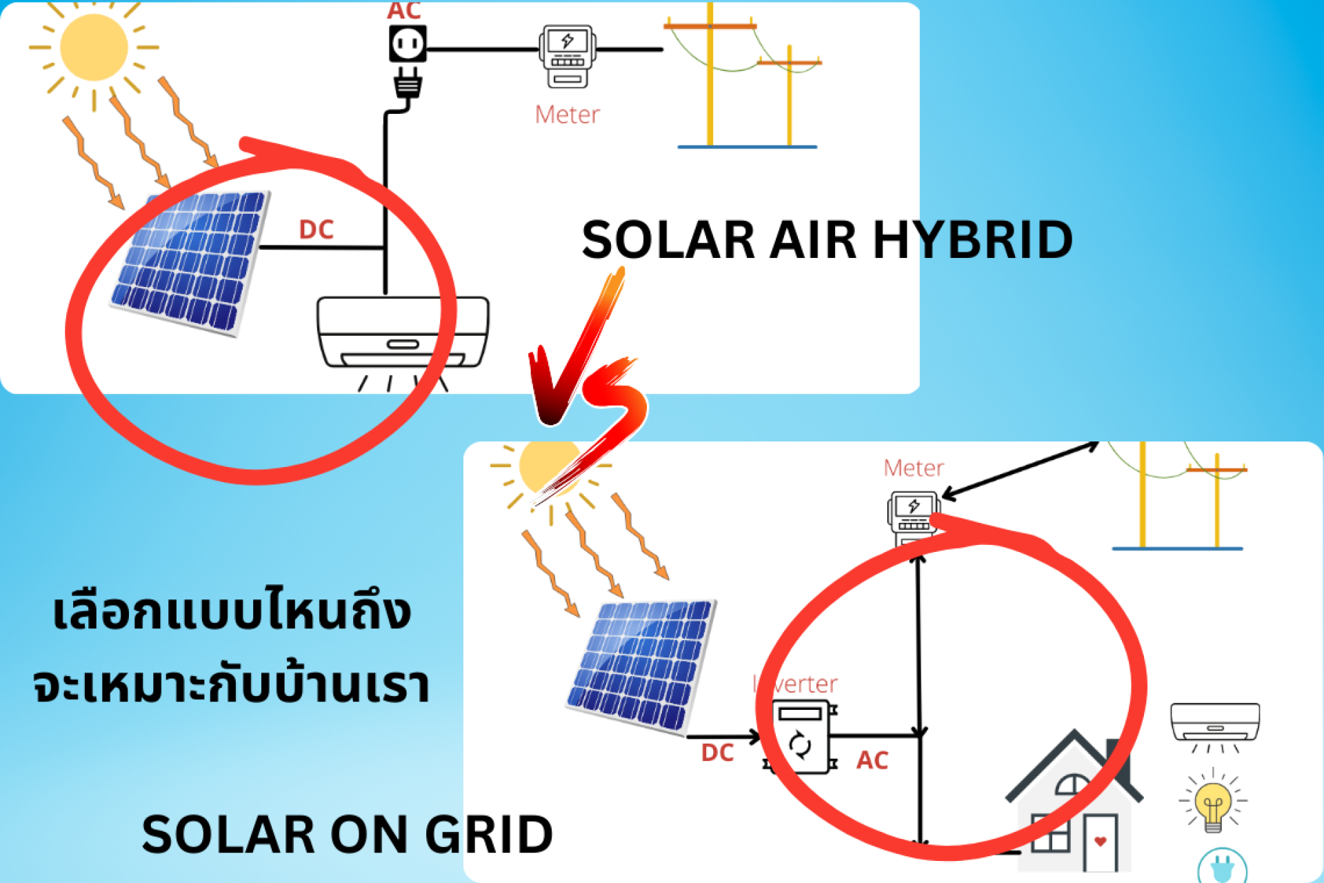 2. แอร์ Solar เป็นแอร์ระบบ DC Inverter ต่อตรงเข้าที่แผงข้อดีคือ เกิดการสูญเสียพลังงานไฟฟ้าที่ผลิตได้น้อยมากเพราะไม่มีตัวแปลงไฟ ไม่ต้องขออนุญาติการไฟฟ้า แอร์ 1 เครื่องต่อ 1 ระบบ ไฟฟ้าที่ผลิตจากแผง ก็จะจ่ายเฉพาะแอร์ตัวนั้นๆ ระยะคืนทุนประมาณ 2.5ปี (แล้วแต่รุ่นที่ติดตั้ง) เน้นค่ะ แบบนี้ต้องเป็นแอร์ DC ใช้กับระบบแอร์ เดิม (AC)ไม่ได้ค่ะ แบบนี้จะเหมาะหากติดตั้งจำนวนไม่เยอะ เพราะต้นทุนแอร์ระบบ DC สูงกว่าแอร์ทั่วไปค่ะ